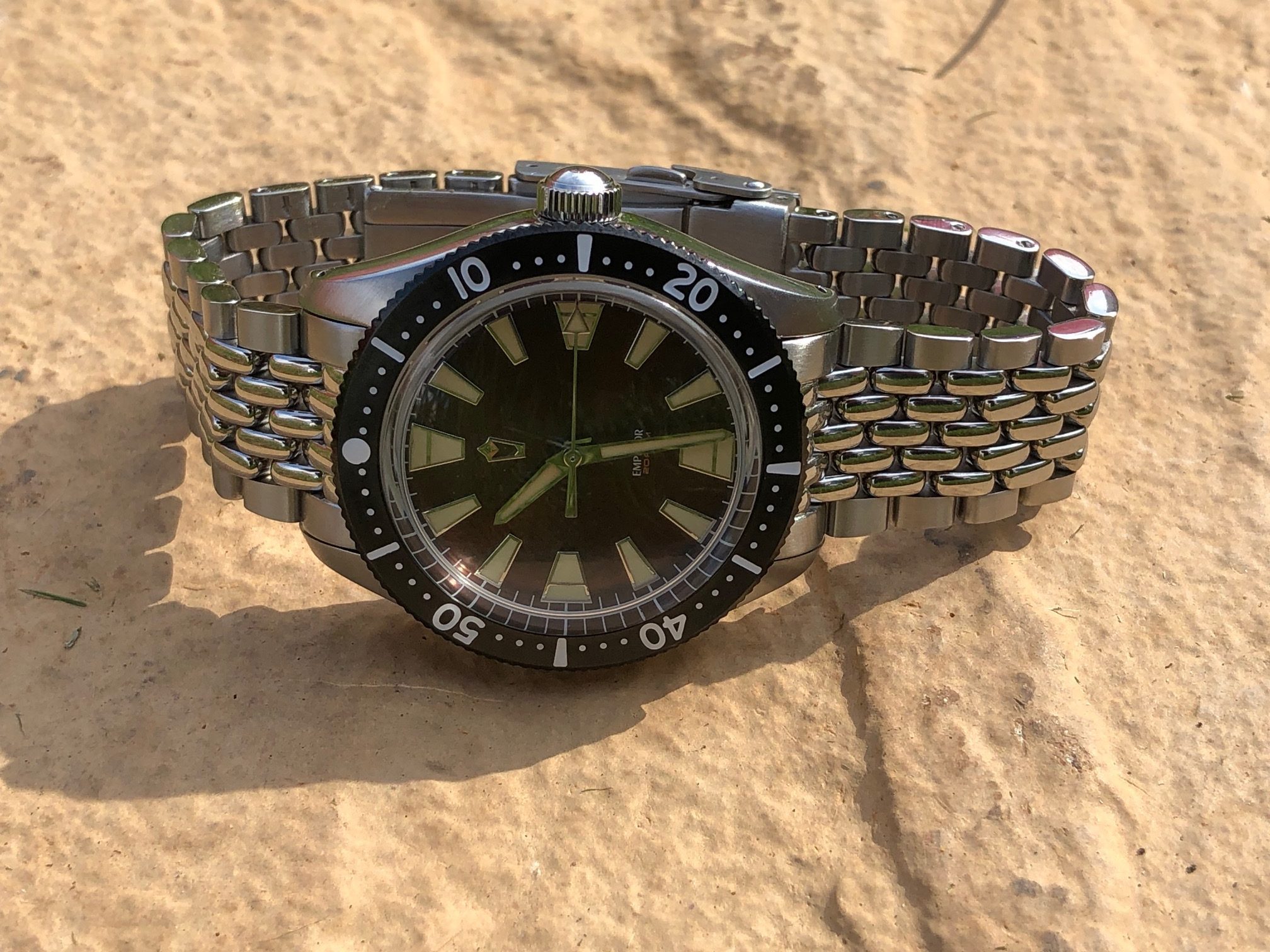 The bracelet is a real stand-out feature of the Emperor Diver. It was the first thing I noticed about the watch. Most dive watches in this price range have something like the Rolex jubilee bracelet or a simple rubber strap. Each link is a seven-piece “beads of rice” design. The removable links are properly screwed, not fitted with split pins, which is unusual for an affordable watch. Needless to say, the whole thing looks and feels amazing.