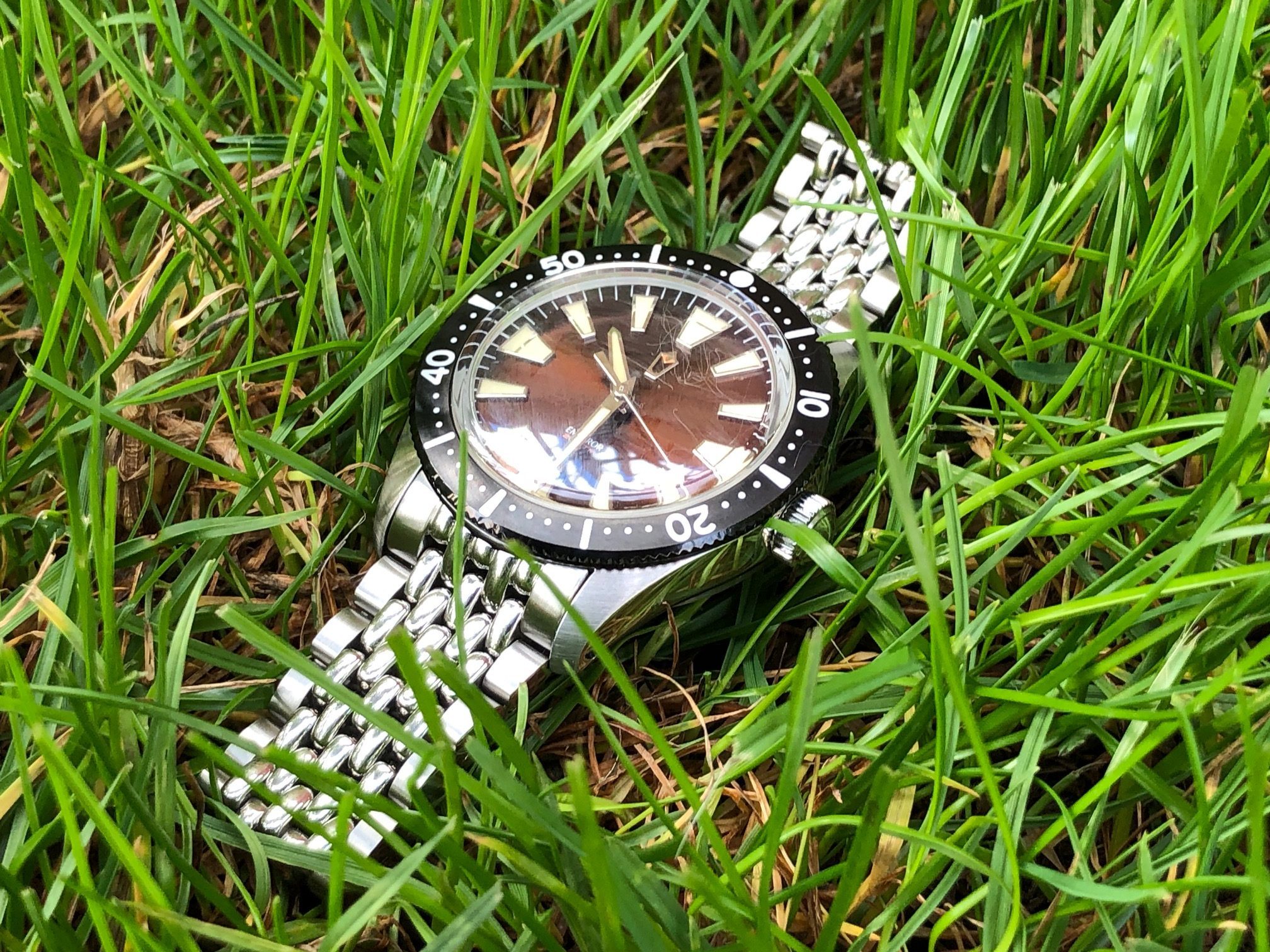 Black, blue and brown dials have been produced, with this brown model probably being my least favourite. That’s not to say there is anything wrong with it, but I think that it falls somewhere between the ultra-clarity of white hands on a black dial and the “pop” of blue. On the other hand, this model is the only one with the vintage lume, which I think looks amazing. If I had to pick a fault, it would be the fact that the bezel is lumed in white and glows green. In both light and dark it it does not match the colour of the indices.